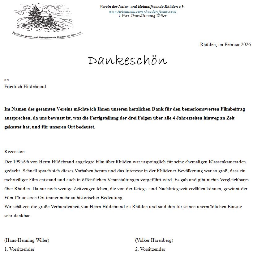 Filmdokumentation „Rhüden, das Dorf meiner Kindheit“. Verkürzte, nur auf Personen bezogene Version des ursprünglichen Dreiteilers, die im Verein der Natur- und Heimatfreunde Rhüden e.V. am 10. Februar 2026 ausgestrahlt wurde.